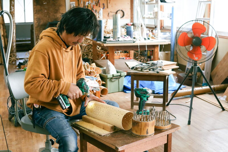 竹あかりの制作にはまず、伐採した竹を半年ほど乾燥させたあと、耐久性を高めるためにバーナーを使って油抜きをします。次に竹の表面にデザインの型紙を貼り付けて、専用のドリルで穴をあけていきます。最後に、やすりで表面を滑らかに磨いて完成です。